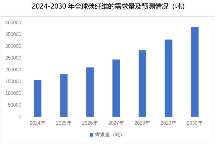 根据《2024年全球碳纤维复合材料市场报告》数据,2024年的全球需求数据为156,100吨,同比增长了35.7%。预计到2030年达到381,800吨,年均复合增长率为16%。
