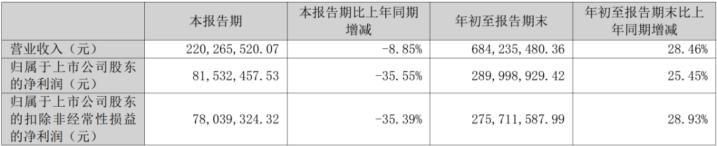 2025年前三季度,公司实现营业收入6.8亿元,同比增长28.5%;归母净利润2.9亿元,同比增长25.5%;扣非后归母净利润2.8亿元,同比增长28.9%。