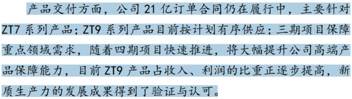 公司将业绩增长归因于:ZT9系列产品目前按计划有序供应;三期项目保障重点领域需求,随着四期项目快速推进,将大幅提升公司高端产品保障能力,目前ZT9产品占收入、利润的比重正逐步提高,新质生产力的发展成果得到了验证与认可。